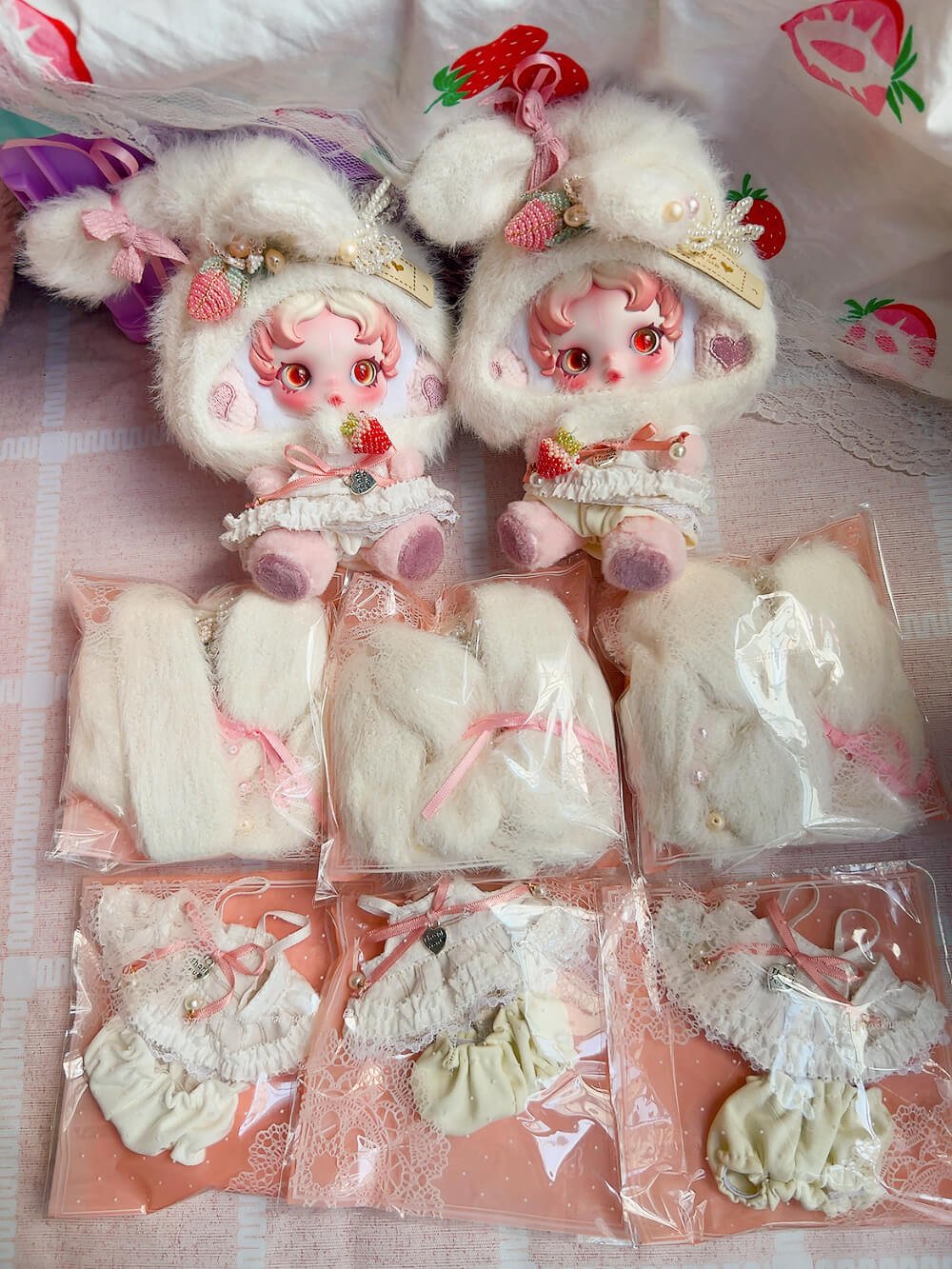 Tenue Skullpanda faite main – Robe style Lapin Fraise pour Ghostie | Adorables vêtements pastel pour poupée avec perles et dentelle
