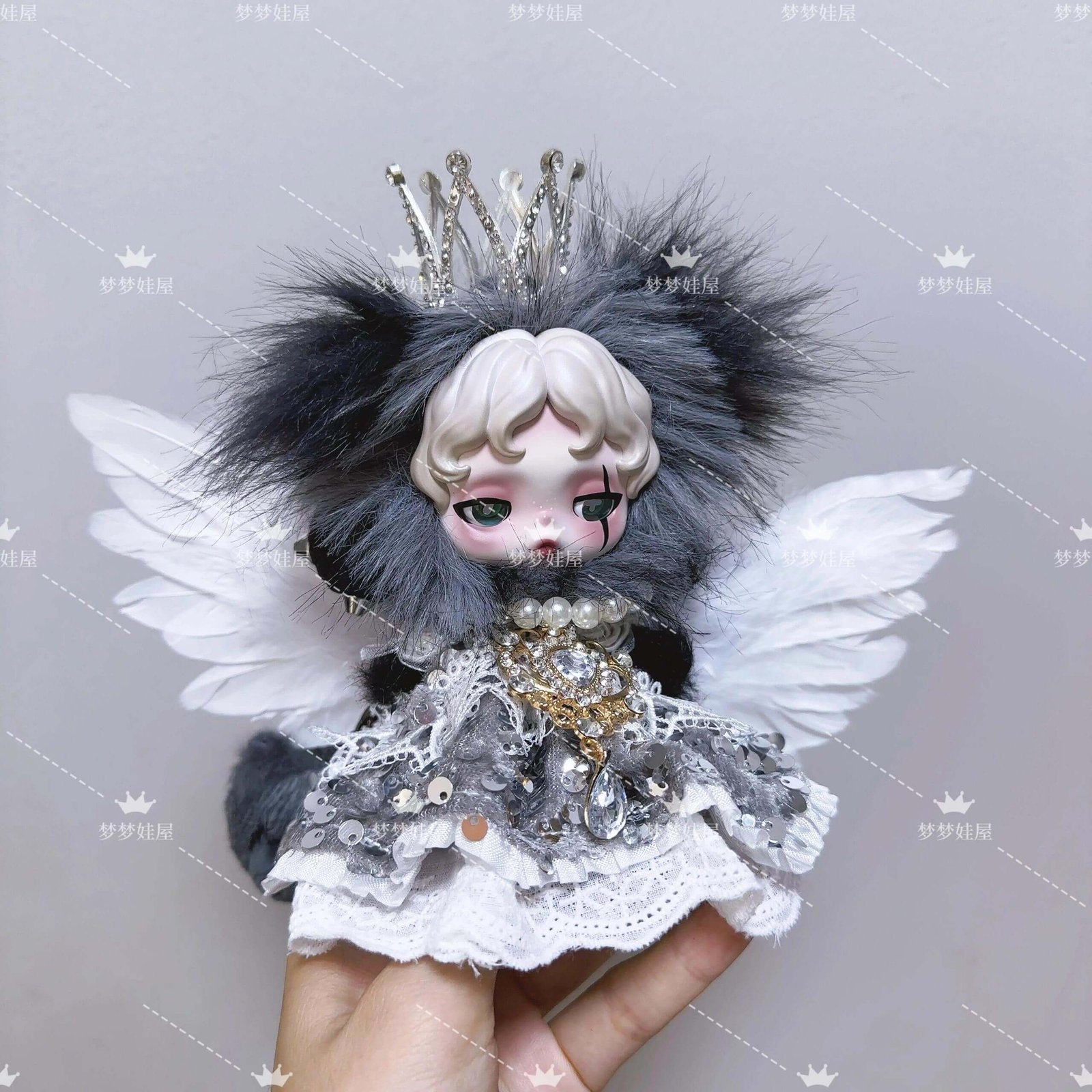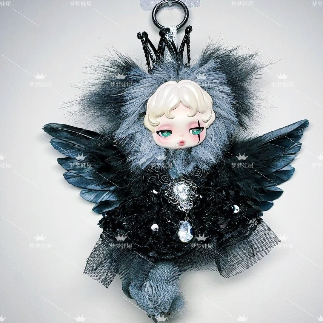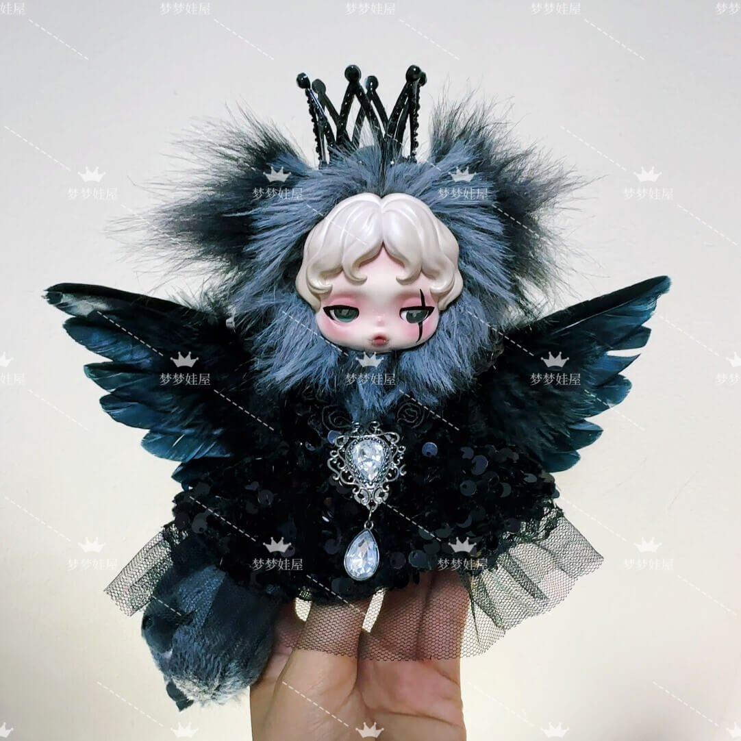 Cet ensemble luxueux comprend fausse fourrure noire riche, plumes veloutées, et un robe à paillettes cousue à la main, créant un mélange saisissant d'élégance et d'énigme. Le scintillement pièce maîtresse en cristal et détails en dentelle gothique reflétez l'aura d'un monarque sombre, apportant une sophistication inégalée à votre affichage.